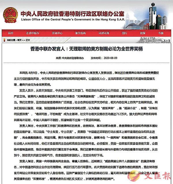 ■ 中聯辦發言人發表談話。 中聯辦網頁截圖 據中聯辦網訊, 8月9日,中央人民政府駐香港特別行政區聯絡辦公室發言人發表談話,指出近日香港輿論場形成譴責美霸權主義行徑的強勁聲浪,中方有關表態得到輿論和網民的...