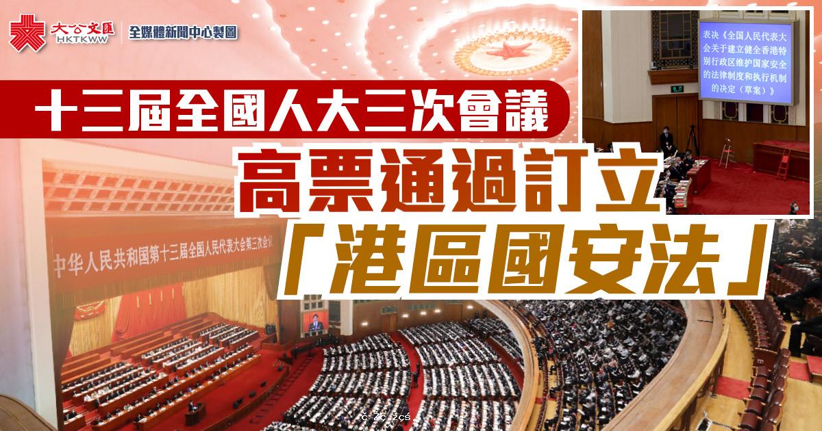 十三屆全國人大三次會議今日(28日)高票通過訂立「港區國安法」。全國人大法工委、國務院港澳辦、香港中聯辦、香港特區政府及國台辦紛紛發聲,歡迎及擁護全國人大的這一決定,指「港區國安法」堵塞國家安全的法律...