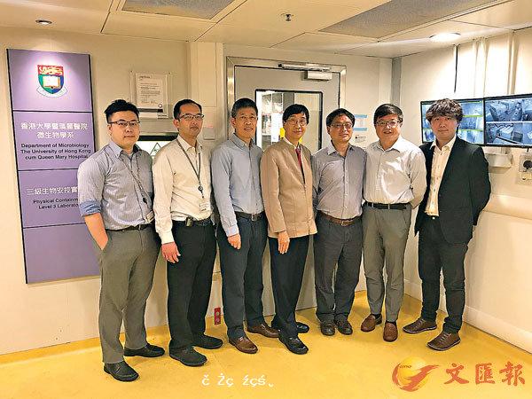 ■ 陳鴻霖(左三)與其團隊正研究新冠肺炎疫苗。 港大圖片 港大研發正進行動物測試 期望18個月內推出市場...