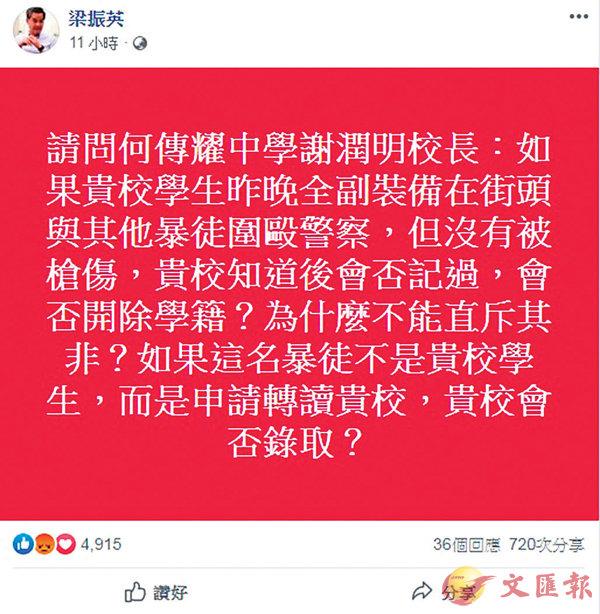 ■梁振英質問謝潤明處理手法。 梁振英fb圖片 有暴徒前日在荃灣街頭向警員施襲期間受槍傷,事後證實為18歲的何傳耀中學中五學生。煽暴派即大做文章,以所謂「學生中槍命危」的片面之辭散播仇警情緒。全國政協副主席梁...