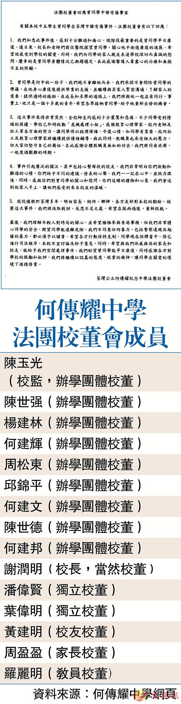 18歲中五學生曾志健10月1日在荃灣連同一班暴徒長時間瘋狂襲擊警察,最終中槍受傷及被捕,隨即被控以一項暴動罪和兩項襲警罪。其就讀的荃灣公立何傳耀紀念中學的法團校董會昨日回應稱,對事件十分難過和痛心,但其中...