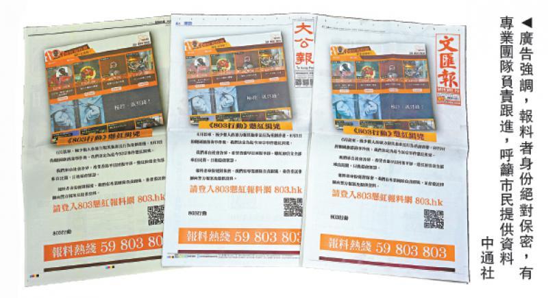 大量暴徒至今逍遙法外,有人昨日在《大公報》、《文匯報》等多份報章刊登全版廣告,發起「803行動」懸紅緝兇。有關人士在廣告指出,自從八月三日拋國旗落海事件後,他們決定為迄今30宗事件懸紅緝兇。懸紅介乎20萬至...