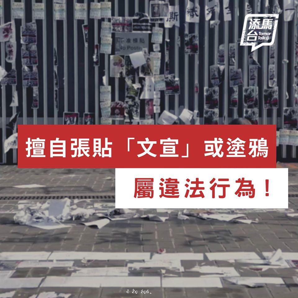 特區政府去年年底針對連月來的社會事件開立Facebook專頁添馬台 Tamar Talk,提供有關香港社會事件的資料,反擊虛假消息澄清謠言。添馬台14日發文稱,在公眾地方擅自張貼「文宣」可能觸犯《公眾衞生及市政條例》。塗...