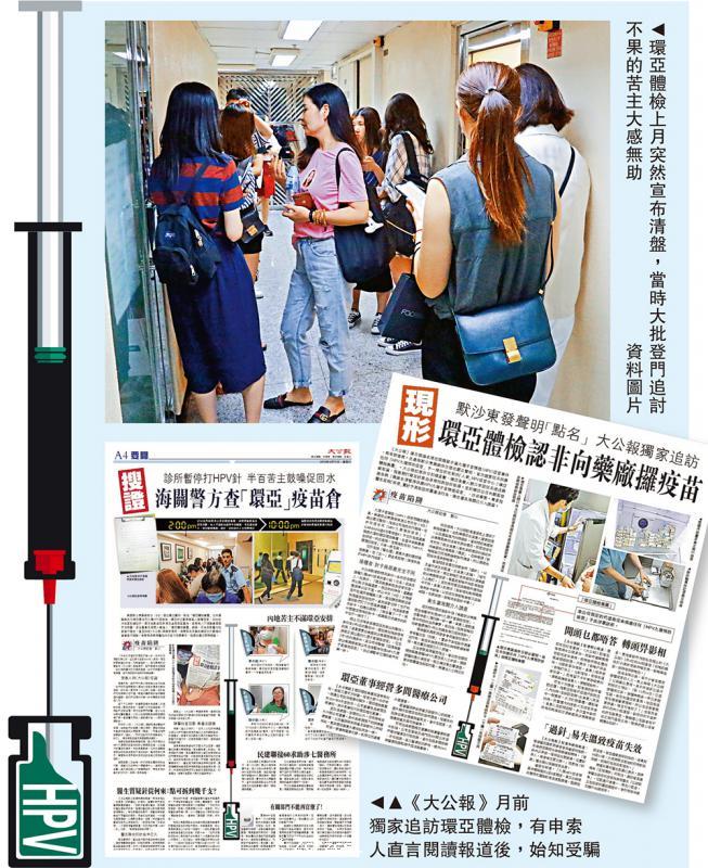 早前被藥廠點名從未獲供應正貨疫苗的環亞體檢集團,數月前突然宣布清盤結業。11名購買疫苗的內地客,早前入稟小額錢債審裁處要求環亞體檢退款6600至8360元不等,審裁官昨在各案件提訊時,剔除了兩宗未成年申索人的案...