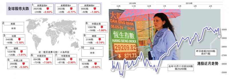 正當市場預期中美即將達成貿易協議,美國總統特朗普突然變臉,擬向中國進口商品加徵關稅。特朗普的「神經刀」嚇窒環球投資市場,亞太區股市昨日全線向下,歐洲股市亦低開。港股最多暴跌1125點,收市時創今年最大跌幅...