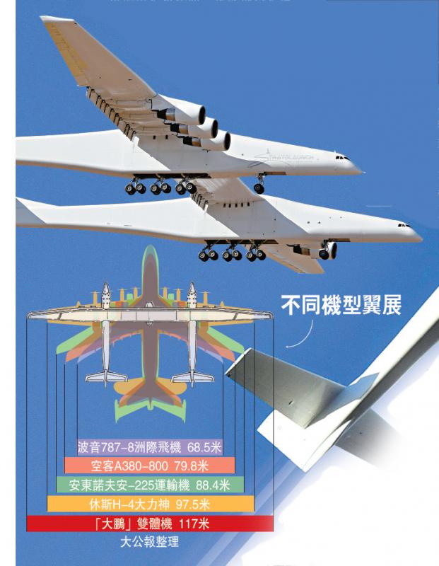 據法新社、德國之聲、新華社報道:13日,由已故的微軟聯合創始人保羅.艾倫發起製造的雙體飛機「大鵬」(Roc)在美國加州首次升空試飛成功,成為超越空巴A380的最大飛機。該飛機的設計用途在於將火箭帶至高空,並進...