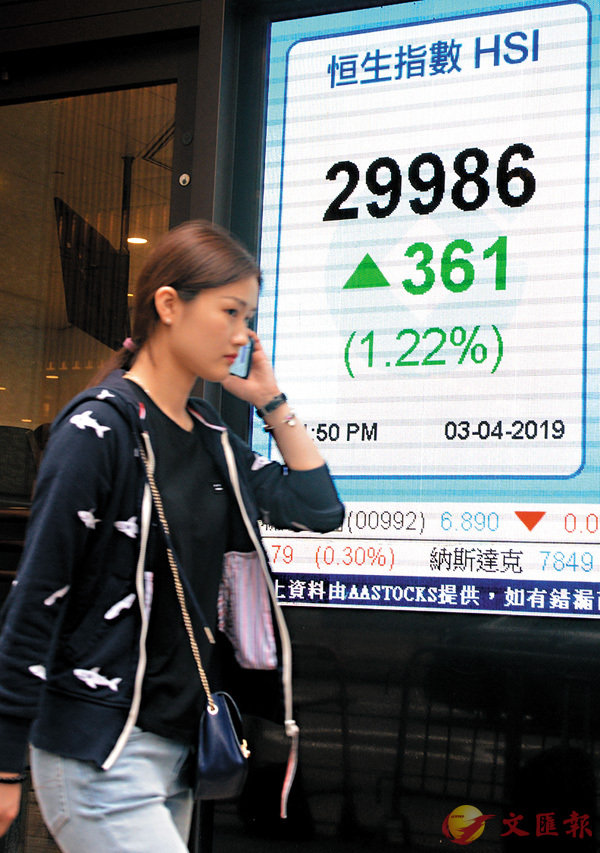 ■港股昨撲三萬大關,成交1,229億元。 中通社內地經濟數據續改善及中美貿易談判有進展,推動港股連升第7日,創15個月以來的最長升市。恒指昨日曾升至29,999點,「差一點」就重上3萬點大關,全日仍收報29,986.3點,再...