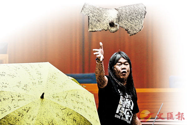 ■梁國雄宣誓完再大叫口號,然後放下黃傘,將一張寫有「人大8.31決議」字樣的紙張撕碎,拋向空中。資料圖片判詞指釋法可追溯至19972016年立法會發生宣誓風波,包括在宣誓前後高叫口號的社民連「長毛」梁國雄等6人,...