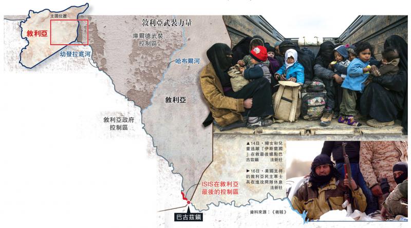 據路透社、法新社報道:極端組織「伊斯蘭國」(ISIS)在盟軍的攻勢下在敘利亞與伊拉克節節敗退,目前只剩下敘伊兩國邊境上一小塊領地,料將很快被殲滅。美國總統特朗普16日表示要求英法德等歐洲國家接收並審判在敘...
