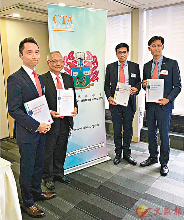 ■香港稅務學會預料2018/19年度政府財政盈餘有500億元,主要因為印花稅及賣地收入均下跌。左起:稅務學會理事邊宗偉、前會長與顧問委員會主席王銳強、會長崔慶昭和副會長吳錦華。樓價股市波動致收入減 倡引入間接稅徵...