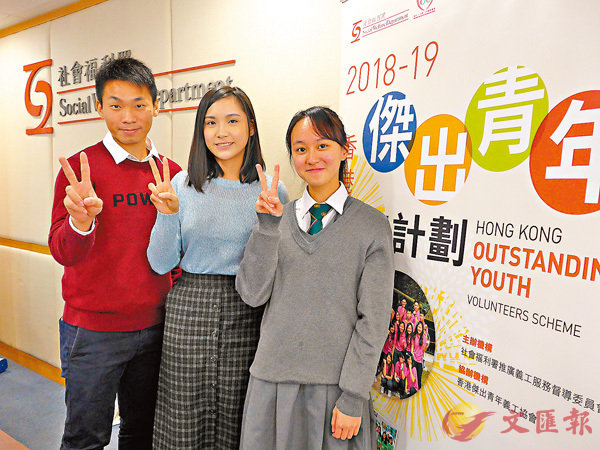 ■左起:傑出青年義工石毅俊、劉羨文、鄧燕鈮做出代表義工(Volunteer)的「V字」手勢。 香港文匯報記者岑志剛 攝曾為街童幸社工引領 盼用自身所學為柬貧童建校做義工不僅可改變別人命運,也能豐富自己的人生。2018-20...