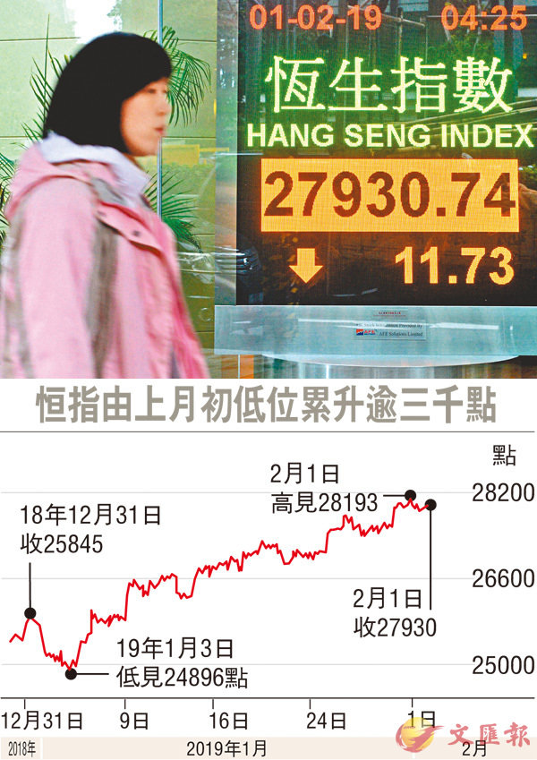 ■港股上周五在28,000點關口再得而復失,今日半日市後結束狗年交易。 中新社港股將於今日半日市後結束狗年交易,及後於本周五(年初四)復市,故本周港股只有一日半交易時間。由於中美貿易談判出現進展,兩國領導人或...