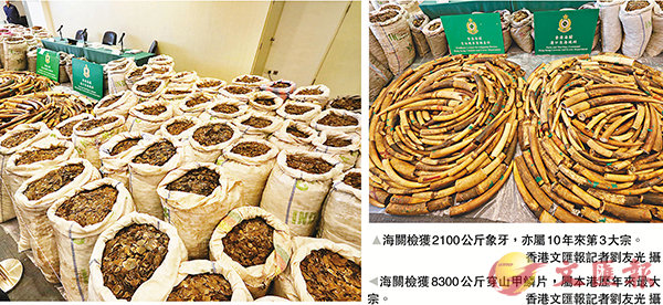 香港海關破獲歷來最大宗走私穿山甲鱗片案。早前海關根據內地情報扣查一個報稱運載急凍牛肉的貨櫃箱,於一層凍肉及冰塊作掩飾「保護罩」下檢獲8,300公斤穿山甲鱗片及2,100公斤象牙,總值6,200萬元,海關根據船務文件拘...