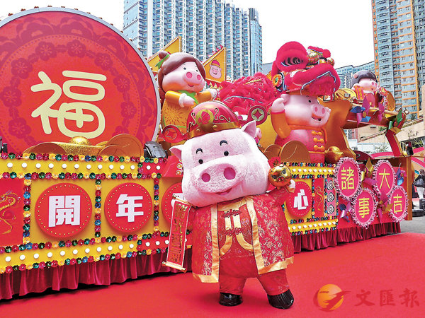 ■新春花車巡遊將於年初一晚上8時舉行,其中不少花車加入「豬嘜」元素,圖為旅發局花車佈置10隻身穿傳統唐裝的小豬。香港文匯報記者岑志剛 攝9花車13表演隊迎新春 增互動打機可贏大獎下周二(5日)便是農曆大年初一。...