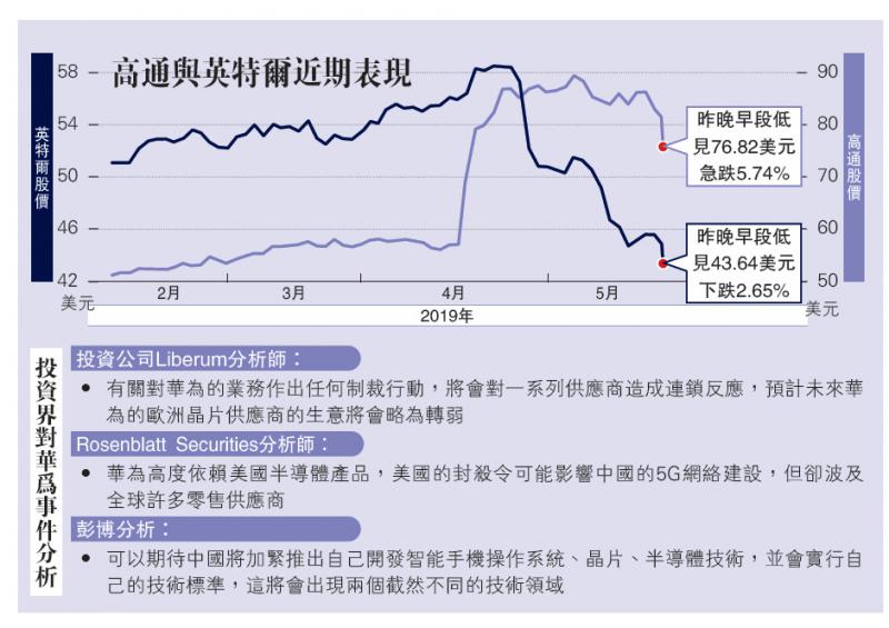 美國封殺華為,拖累華為的歐美供應商股價急跌,高通昨晚早段急瀉5.74%,低見76.82美元,創一個月低位,同樣拒絕供貨的英特爾亦顯著下跌2.65%,至43.64美元。歐洲方面,德國的英飛凌股價亦一度大跌3.4%,其他相關晶片...