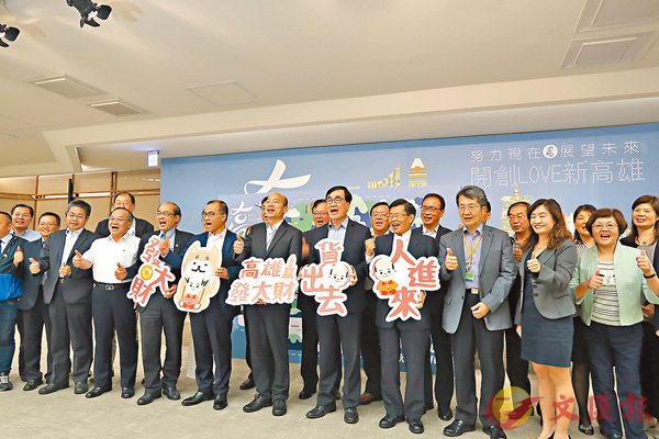 ■就職百日施政滿意度調查,韓國瑜(前右4)的滿意度61.3%。圖為韓國瑜昨日率市府團隊召開記者會。 中央社稱市府團隊還有成長空間 誓打造高雄成全台首富綜合中國台灣網及中央社報道,高雄市府團隊昨日召開「上任100天...