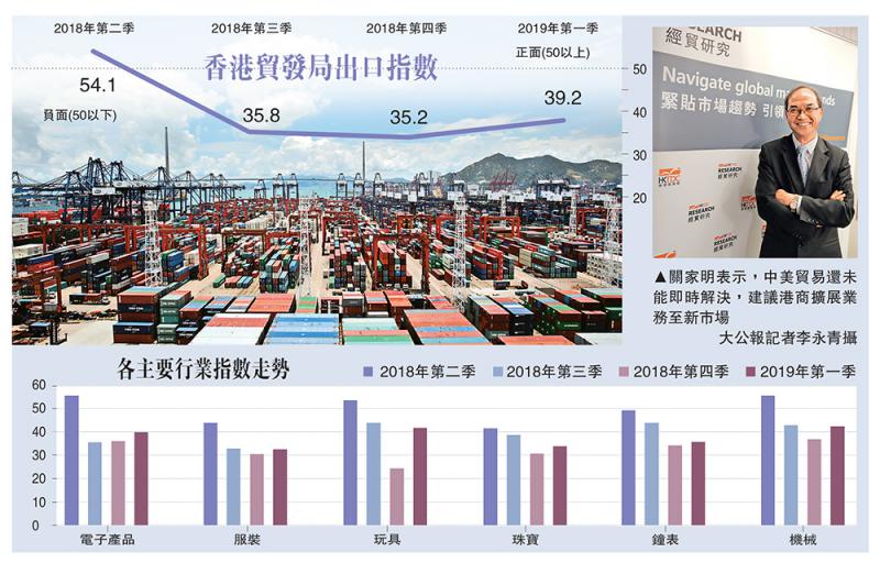 中美貿易談判似漸入佳境,港商對出口信心略有回升。香港貿發局首季出口指數反彈至39.2,按季升4個百分點,但指數仍處於50以下。貿發局研究總監關家明昨表示,中美貿易還未能即時解決,建議港商擴展業務至新市場。他...
