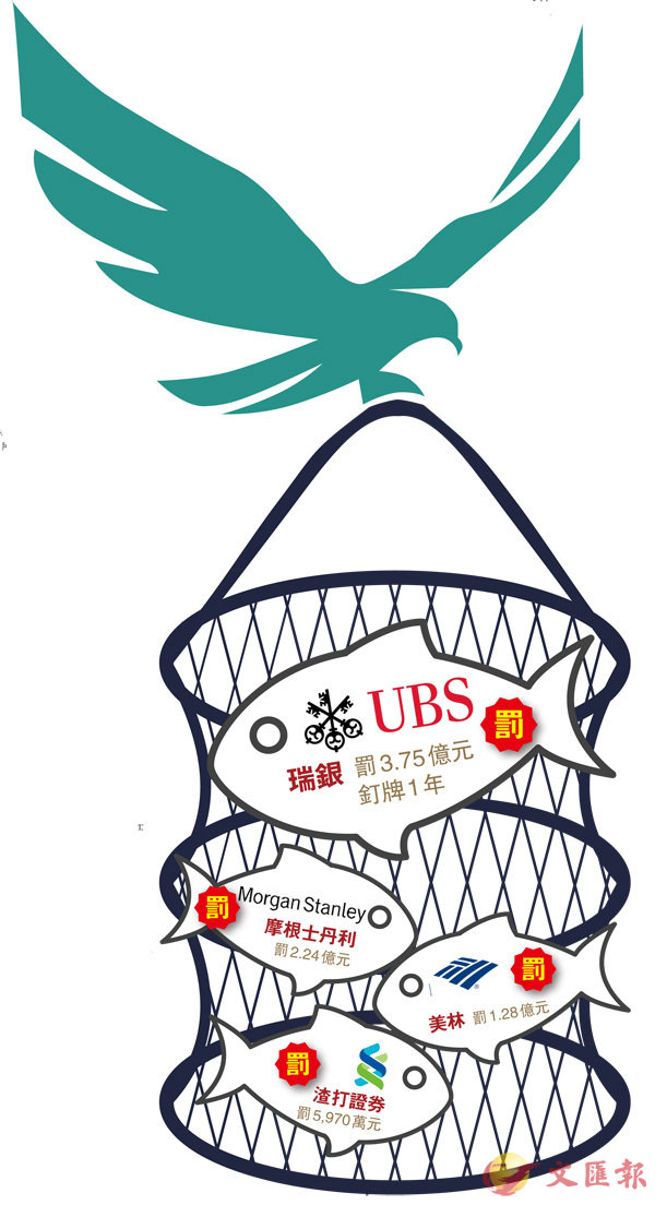 ■證監連環出手重罰涉缺失保薦人。圖飛鷹為證監標誌。瑞銀薦3新股涉多項缺失 罰3.75億釘牌1年最重 香港證監會向保薦人開出本港史上最大額罰單。證監昨連環出手,向4間涉及缺失的新股保薦人瑞銀、渣打、美林及摩...