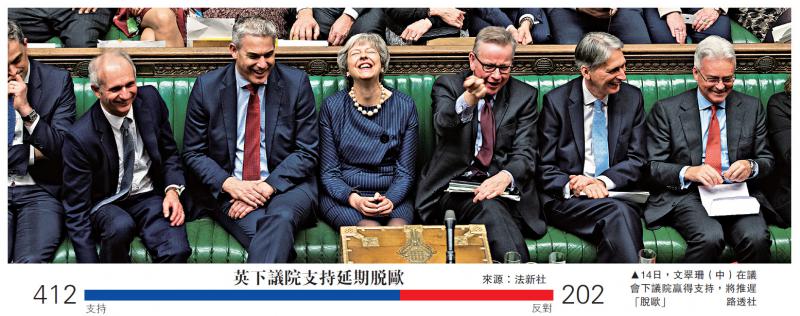據路透社、英國《金融時報》及新華社報道:英國議會下議院14日表決通過延遲脫歐,首相文翠珊的脫歐協議下周將第三度在議會闖關,若獲得支持,她將在再赴布魯塞爾尋求歐盟同意延期。若獲得首肯,「脫歐」將至少推遲...