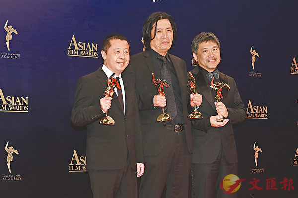 ■左起:賈樟柯、李滄東及是枝裕和惺惺相惜。第十三屆亞洲電影大獎頒獎禮今年移師回到香港,並於昨晚假將軍澳電視城舉行,「最佳男、女主角」由役所廣司及Samal YESLYAMOVA榮膺,「最佳電影」是《小偷家族》,「最佳...