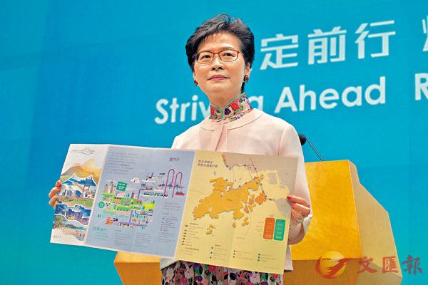 ■ 特首林鄭月娥上周在政府總部出席2018年施政報告記者會時手持東大嶼山填海構想圖。 資料圖片針對香港土地供應不足以應付建屋需求,令輪候公屋年期愈來愈長的問題,香港特區行政長官林鄭月娥於新年度施政報告提出填...