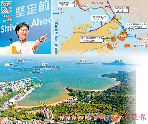 造地1700公頃 供110萬人安居 勢成第三商業中心行政長官林鄭月娥昨日發表任內第二份施政報告,在土地、交通、房屋、勞福等範疇上均「大刀闊斧」,其中最令人注目的是「明日大嶼願景」計劃。政府擬於中部水域分階段填出...