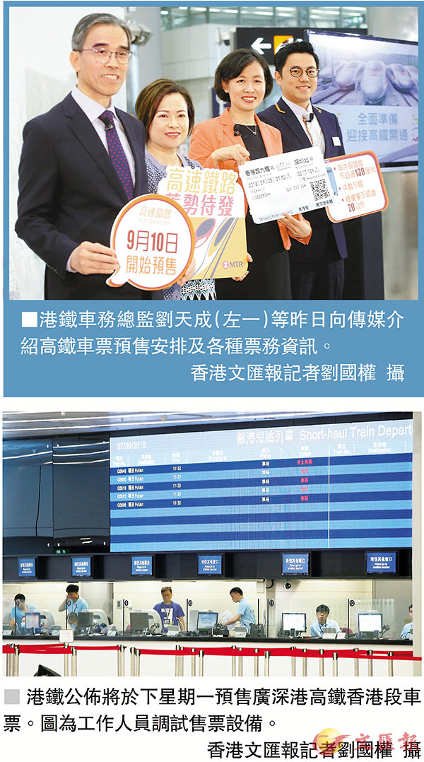 兩地同步 港獲最多六成配額 每人限購8張廣深港高鐵香港段於本月23日通車,港鐵昨日正式公佈售票安排,於下周一(10日)發售通車日起首10日車票,每人限買8張,翌日才開始預售28日內車票。西九龍站售票處於當日早上8時...