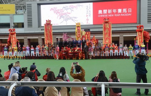 2月18日,戊戌狗年大年初三香港賽馬會在沙田馬場舉行《農曆新年賽馬日》。圖為香港賽馬會一眾高層要員與演出藝人及一眾騎師齊齊向大家拜年。香港中通社圖片2月18日,戊戌狗年大年初三香港賽馬會在沙田馬場舉行《農曆...
