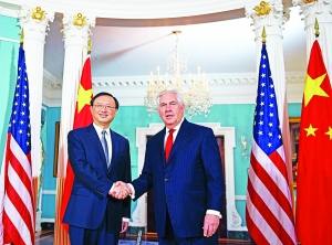 【中新社華盛頓八日電】當地時間8日,正在美國訪問的中共中央政治局委員、國務委員楊潔篪在美國國務院同美國國務卿蒂勒森舉行會談。 楊潔篪表示,過去一年,在習近平主席和特朗普總統共同引領下,中美關係取得重要積...