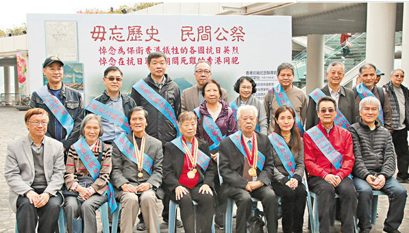 ■約20名香港抗戰紀念聯席成員昨日於尖沙咀文化中心廣場外舉行集會及展覽,前排左四為林珍。嘆港青不熟國情亂舉「龍獅旗」 冀多認識抗戰史傳承薪火二戰期間香港淪陷3年8個月,是上一輩港人的慘痛回憶。多名東江縱隊港...