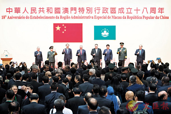 ■澳門特區政府舉行酒會慶祝澳門回歸祖國18周年。嘉賓在酒會上祝酒。新華社何厚鏵鄭曉松葉大波王文周吳剛出席酒會 崔世安致辭香港文匯報訊綜合新華社、中新社報道,昨日是澳門回歸祖國18周年的大日子,澳門特區政府昨...