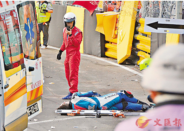 ■赫加迪失事後重創昏倒賽道上待救。澳門格蘭披治大賽車昨發生多宗「炒車」意外,其中格蘭披治電單車大賽中,騎8號車的英國車手赫加迪(Daniel Hegarty)高速駛入漁翁彎時,電單車突失控翻車,赫加迪被拋飛猛撼防撞欄...