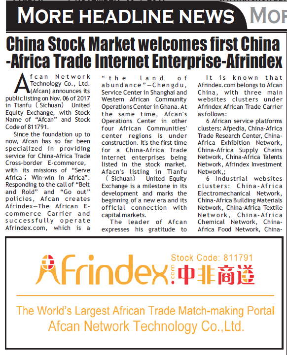 2017年11月6日星期一,四川愛非客網絡科技有限公司(以下簡稱“愛非客”)在天府(四川)聯合股權交易中心成功掛牌(證券名稱:愛非客,證券代碼:811791),引起了非洲各大媒體的廣泛關注和報道。加納商業日報於網站首頁刊...