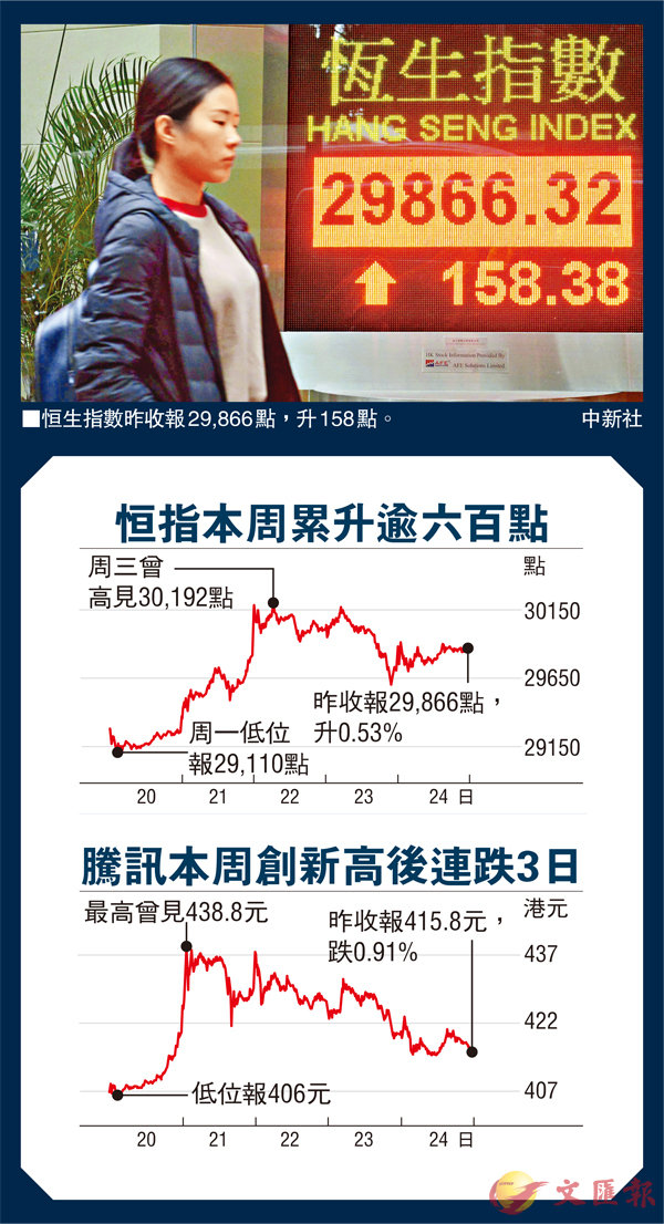 ■恒指十年來昨首次重上3萬點收市,成交暢旺,達1,574億元。 中通社港股牛氣沖天。受隔夜美股齊齊上升帶動,恒指昨日開市已破3萬點關口,最高曾見30,199點,其後雖然一度倒跌,但大量資金追捧港交所(0388)、匯控、...