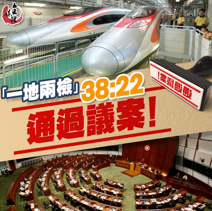 【文匯網訊】 大公文匯全媒體報道:香港立法會今日(15日)繼續審議高鐵香港段「一地兩檢」議案。下午近5時,議案以38票贊成、22票反對獲得通過。来源:文汇网...