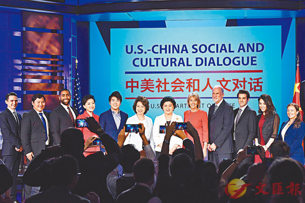 ■當地時間9月28日,中國國務院副總理劉延東(右六)在美國交通部長趙小蘭(左六)、教育部長德沃斯(右五)等人陪同下在華盛頓出席中美兩國青年代表對話活動並致辭。圖為活動結束後劉延東與趙小蘭、德沃斯以及中美青...