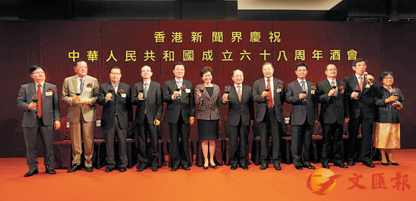 ■一眾嘉賓在香港新聞界慶國慶酒會上祝酒。香港文匯報記者潘達文 攝新聞界慶國慶酒會嘉賓雲集 林鄭月娥致辭香港文匯報訊(記者 陳文華)「香港新聞界慶祝中華人民共和國成立68周年酒會」昨日舉行,本港新聞界等各界人...
