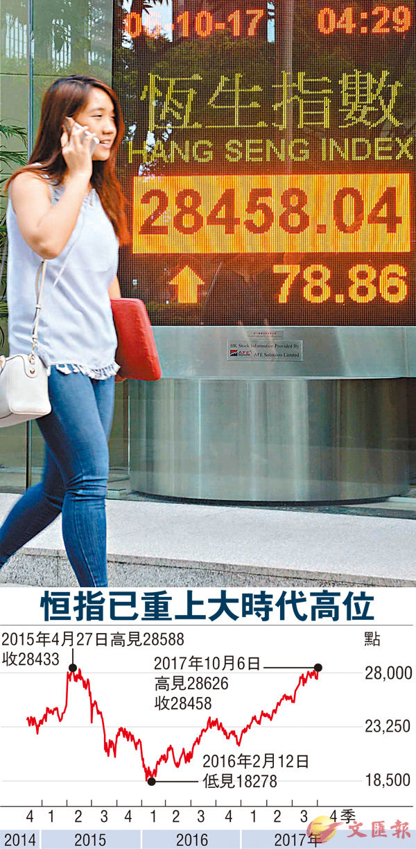 ■港股上周五曾衝破2015年「大時代」高位28,588點,創近十年新高。 中新社內地預告放水 A股有望追落後 利好氣氛香港文匯報訊 (記者 周紹基) 當大家以為國慶長假,港股在A股休市及缺乏「北水」支援下必定淡靜,但人民...