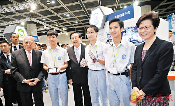 ■董建華、萬鋼、林鄭月娥參觀手語翻譯手套項目展覽,學生們即席示範。董建華:多項有利條件育人才 讚林鄭速出8策推動科技香港文匯報訊(記者 文森)團結香港基金主辦的「創科博覽」昨日開幕,全國政協副主席、團結香...