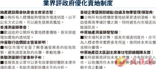 發展局昨日公佈,由下季開始,政府批出標書後約4個星期公佈其他入標者的出價,業界對此普遍歡迎。另一方面,政府維持不恢復公開拍賣土地,發展局局長黃偉綸解釋指,在經濟理論上,拍賣及招標形式賣地的結果相等。...