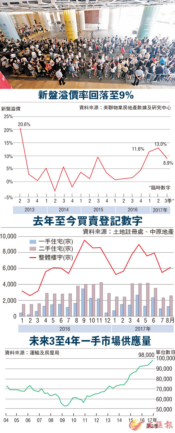 早前荃灣新盤全·城滙在定價上有折讓,加上高成數按揭,「賣大包」誘發購買力,吸引大批買家排隊認購。香港文匯報記者梁祖彝 攝啟示﹕承接力短期或見頂 後市須貼市價開新盤市場上月突然「翻生」,原本上升乏力的樓市...
