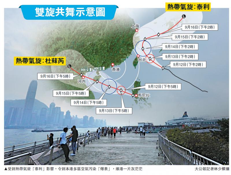 雙旋再共舞,本港再受威脅!香港天文臺預測,位於南海的熱帶氣旋「杜蘇芮」今日會進入本港800公里範圍,向偏西移動,直趨海南島;熱帶氣旋「泰利」則會在今日移向臺灣東部海面,繼而急轉彎吹襲日本。「泰利」昨已發威...