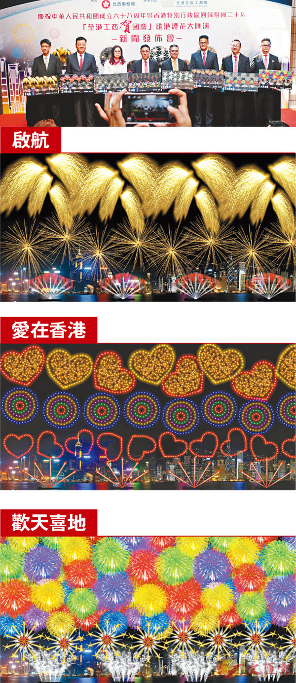 ■「全港工商賀國慶」維港煙花大匯演新聞發佈會,詳細介紹今年國慶煙花特色。 香港文匯報記者梁祖彝 攝全港各區工商聯「打造」千米生日蛋糕 放上維港夜空香港文匯報訊(記者 陳文華)為慶祝中華人民共和國成立68周年...