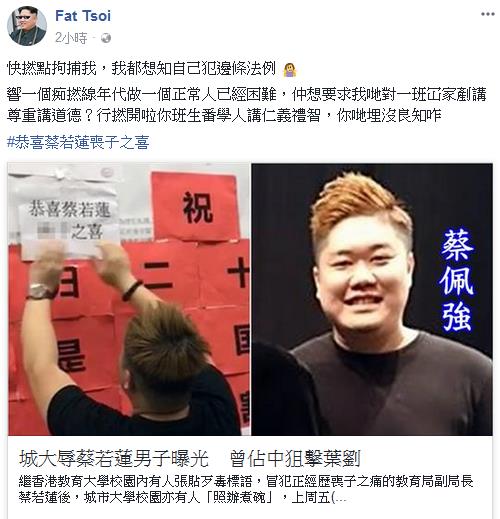 9月8日深夜,在香港城市大學民主牆上張貼冒犯教育局副局長蔡若蓮喪子之痛的男子,遭網民「人肉搜索」大起底,踢爆其曾在城大修讀公共行政學系副學士課程,2013年8月在Facebook(fb)留言恐嚇選舉主任,被警方以不誠實使...