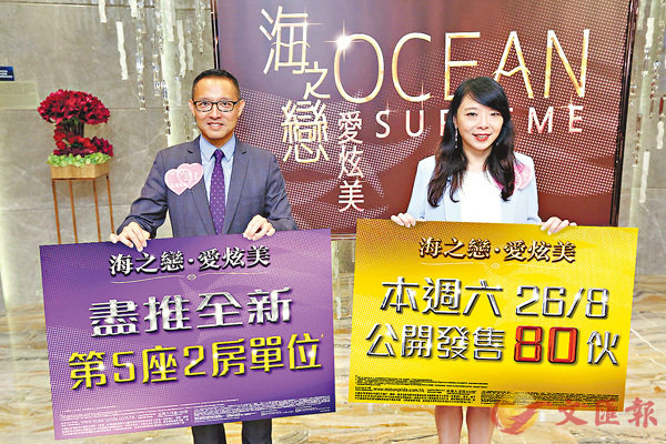 ■長實地產投資董事郭子威(左)稱,有見反應熱烈,集團遂於前晚全數推出海之戀.愛炫美餘下兩房戶。晒冷盡推兩房戶 80伙周六開售香港文匯報訊(記者 梁悅琴)強颱風天鴿昨日正面吹襲本港,一度高掛十號風球,新盤銷情...