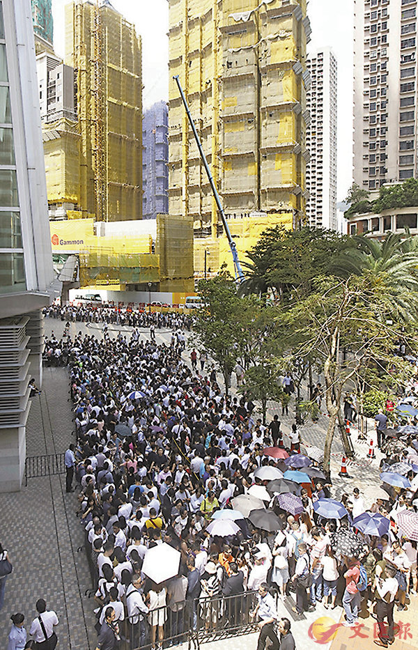 ■全‧城滙(黃色棚架建築物)昨日開售,大批市民在如心廣場外排隊等候進入售樓處。 香港文匯報記者劉國權 攝香港文匯報訊(記者 梁悅琴)挾低市價15%,兼發展商提供八成一按優勢,累收22,893票成為新盤市場歷來第三多...