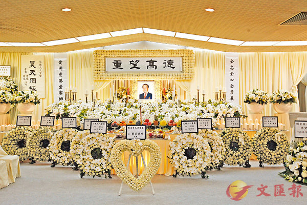 ■鄉議局前主席劉皇發昨日在北角香港殯儀館設靈,靈堂佈置以白色為主調。 香港文匯報記者曾慶威 攝上月23日逝世的鄉議局前主席劉皇發,終年80歲,昨日在北角香港殯儀館設靈。多名政商及社會各界人士到場弔唁,包括中...