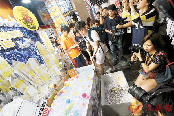 ■張同學(持鏟者) 成功剷到18粒水晶月餅,取得30年免費食榴槤月餅福利。香港文匯報記者梁祖彝 攝香港文匯報訊(記者 楊佩韻)一連5天的美食博覽昨日在香港會展中心開幕,一如以往設1元限時優惠,吸引不少學生與家庭主...