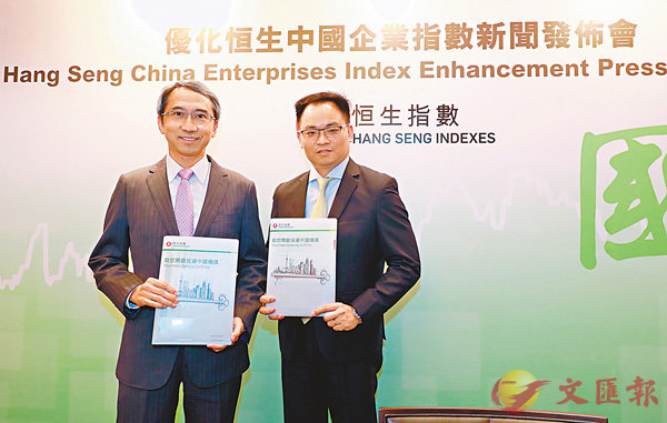 ■恒指公司董事兼總經理關永盛(左)認為,優化指數將能更全面代表在香港上市的中國企業。香港文匯報記者莊程敏 攝成分股增至50隻 市值覆蓋擴至55.8%香港文匯報訊 (記者 莊程敏)恒生指數公司昨公佈優化國企指數計劃,...