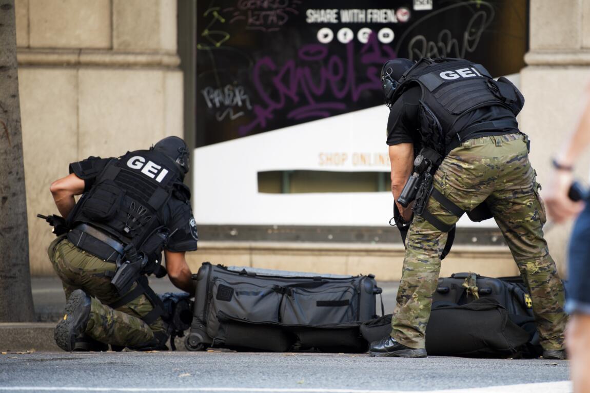 西班牙巴塞羅那17日發生恐襲造成13死80傷。圖為特警在汽車撞人恐怖襲擊事件現場附近執勤(新華社)警用直升機在事發現場上空執勤(新華社)警察協助路人撤離(新華社)救護車在發生汽車撞人恐怖襲擊事件現場附近待命(新華社...